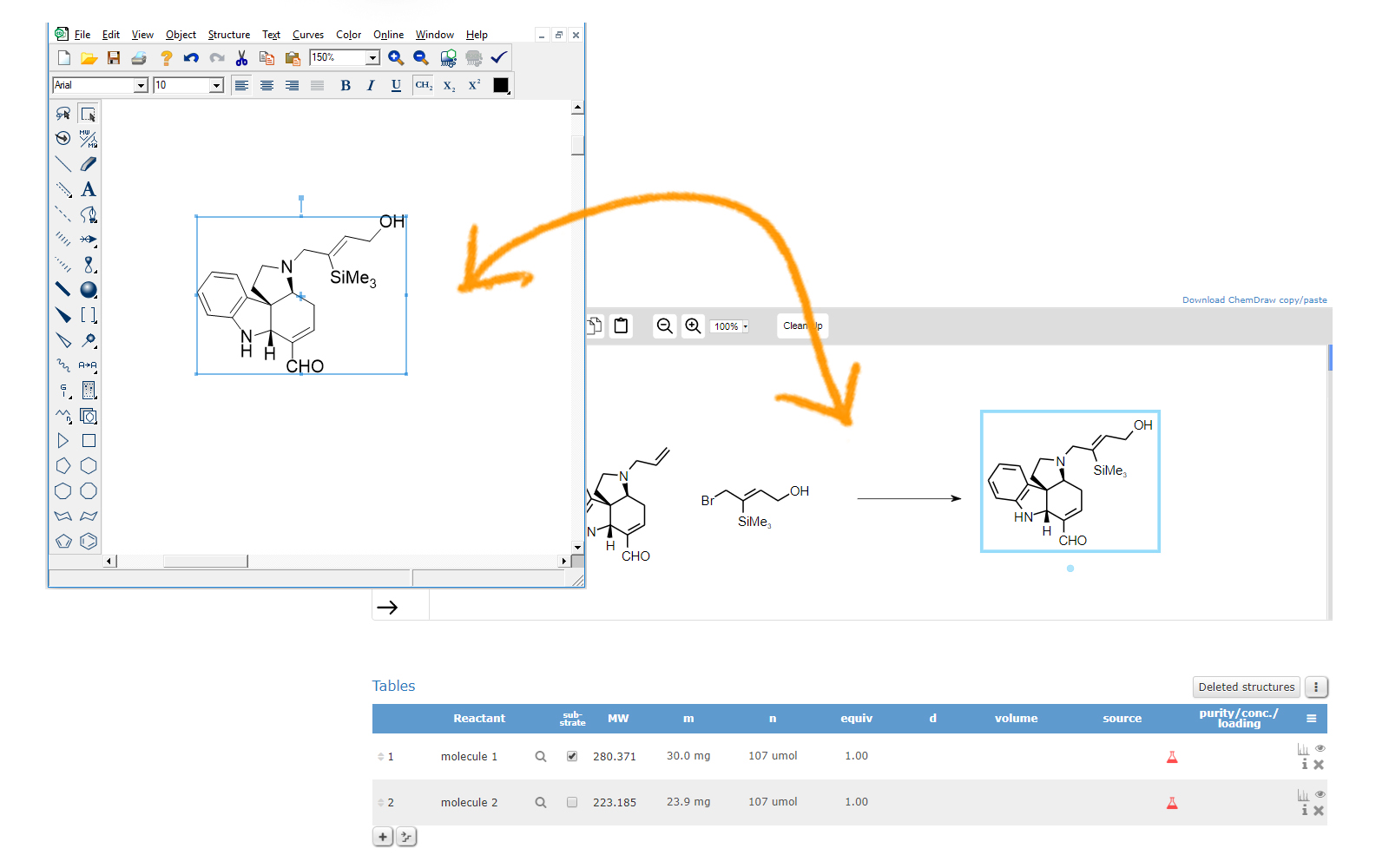 直接复制/粘贴结构式和反应, 在库存中搜索分子,获取自动计算结果和反应物名称, 快速访问所有实验。
